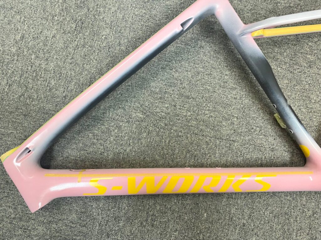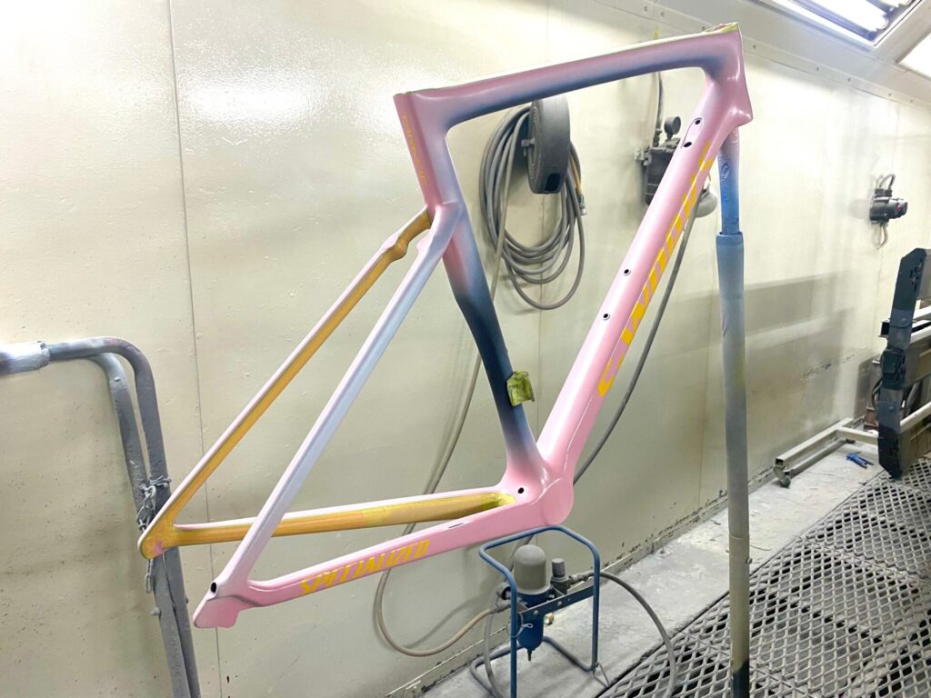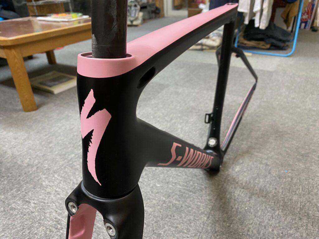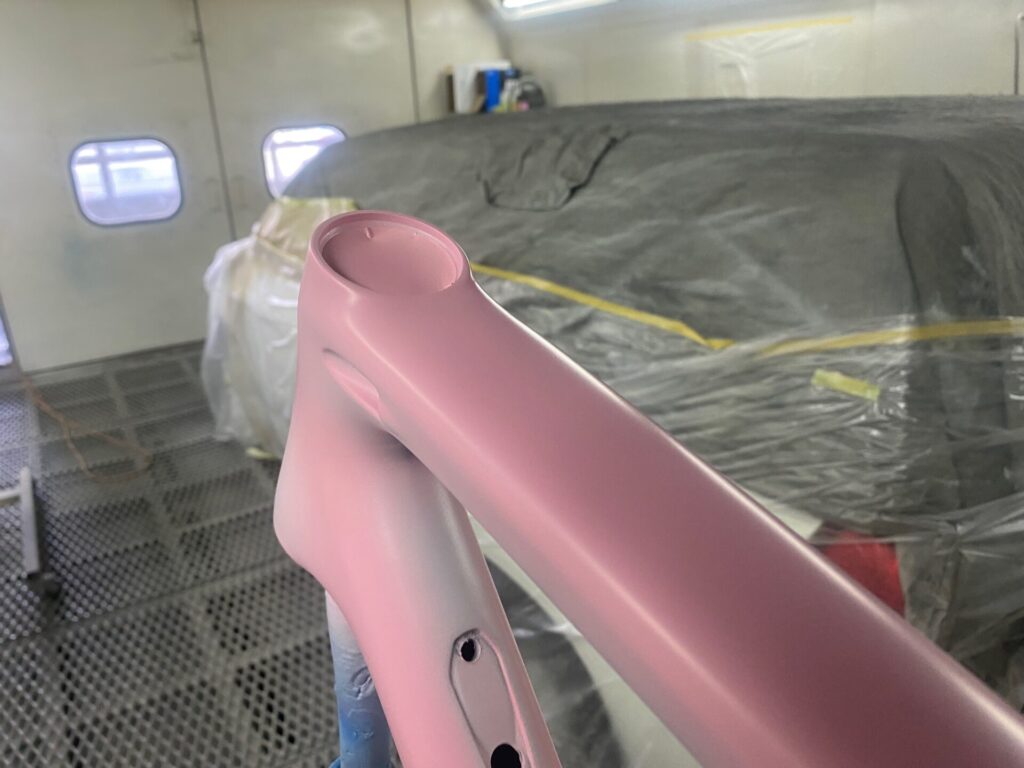 プランとしましては、メインカラーはブラック、各ロゴと後三角内側、フォーク内側、トップチューブ上面をピンク(DIC-2030)にペイントして、全体をマットクリア仕上げです。