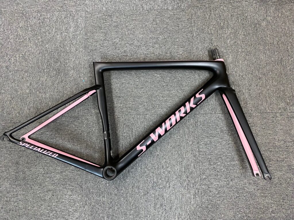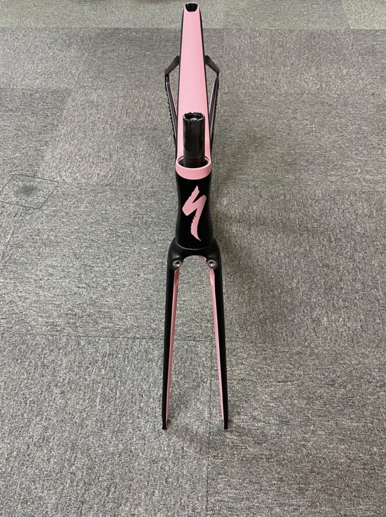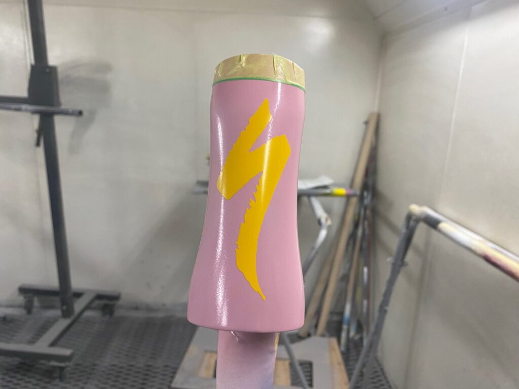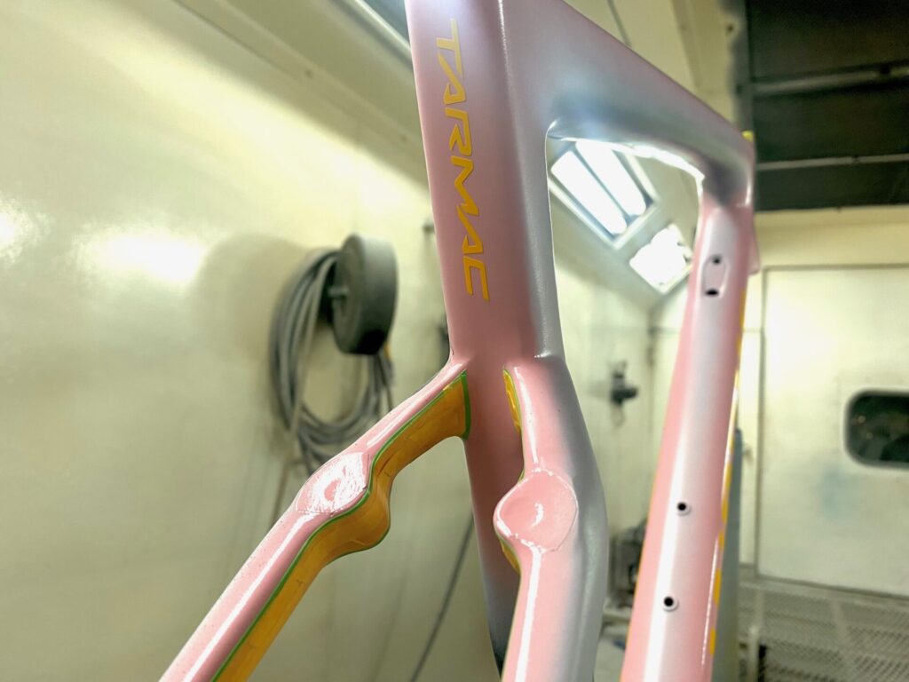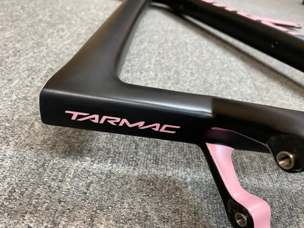 プランとしましては、メインカラーはブラック、各ロゴと後三角内側、フォーク内側、トップチューブ上面をピンク(DIC-2030)にペイントして、全体をマットクリア仕上げです。