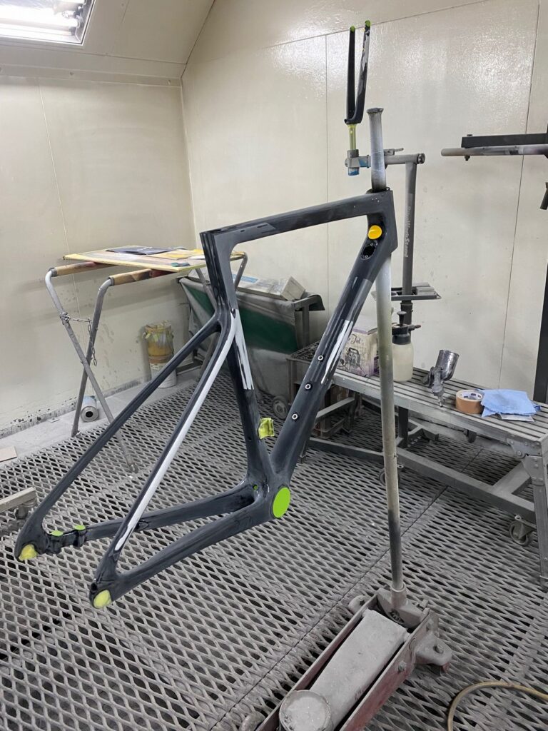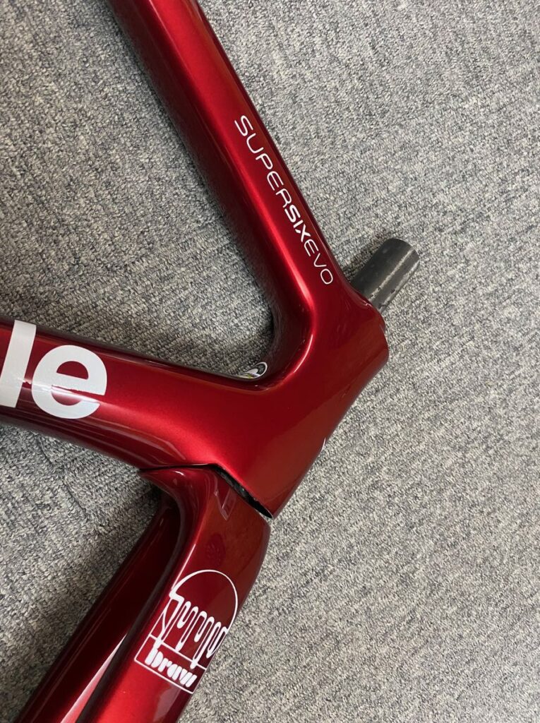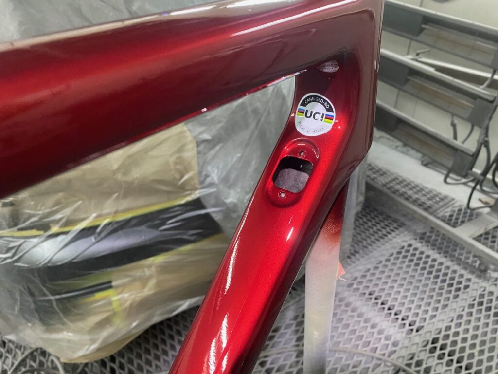 次にロゴのペイントです。ダウンチューブにcannondaleロゴを配置するのがお客様の強いご要望でした。